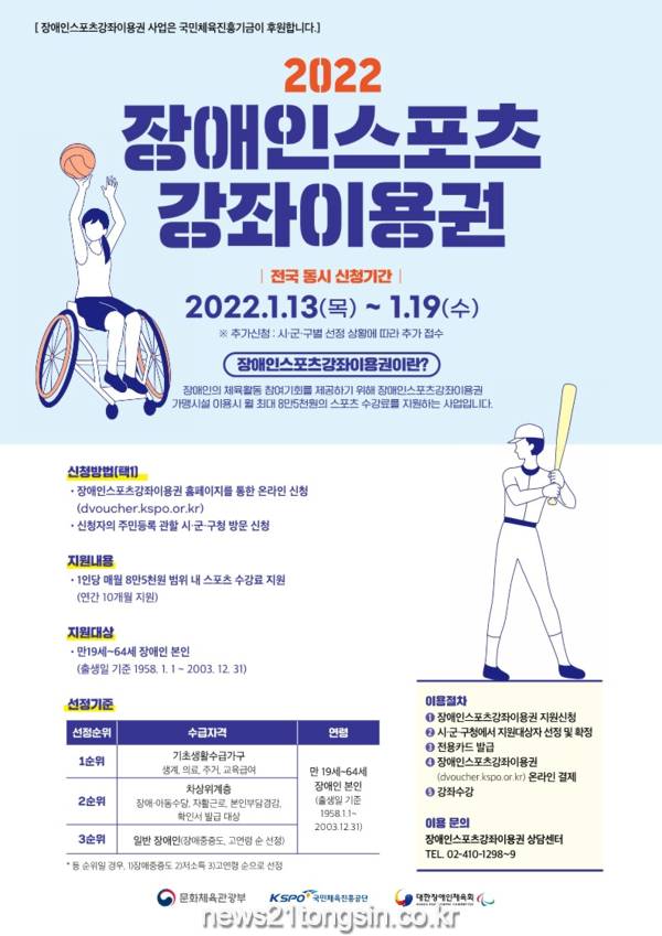- 만19~64세 장애인(출생일 기준 1958. 1. 1. ~ 2003. 12. 31.)을 대상으로 스포츠 강좌 수강료 월 최대 8만5천 원이 지원된다.