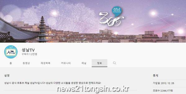2012년 개설하여 올해로 10년차인 유튜브‘성남TV’는 다양한 장르의 고퀄리티 영상을 제작? 홍보하여 현재 1만 2천명의 구독자를 보유(2021년 구독자는 7,323명)하여 1년새 64%의 괄목할 성장을 보였다.