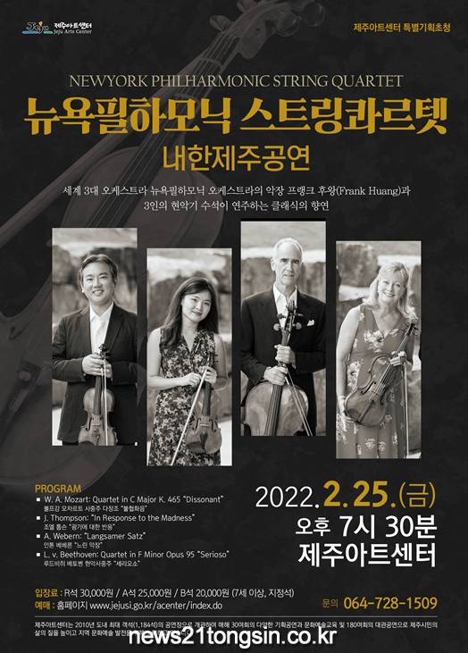 ▲  사진=제주시청제주아트센터(소장 김영기)는 세계 3대 오케스트라인 뉴욕필하모닉오케스트라의 악장과 수석 연주자들로 구성된 뉴욕필하모닉 스트링콰르텟 내한 제주공연을 개최한다.