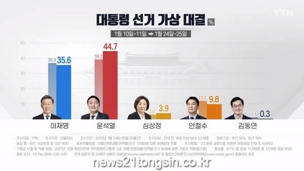지난 24~25일 이틀간 전국 만 18세 이상 남녀 1018명을 대상으로 차기 대선 다자 가상대결 여론조사 결과, 윤석열 후보는 44.7%로 이전보다 5.5% 포인트 상승했으며, 이재명 후보 35.6%로 이전보다 1.3% 포인트 하락했다. 안 후보는 2.4% 포인트 하락한 9.8%로 나타났다.