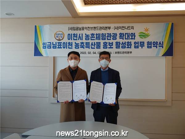 ▲  사진=이천시청임금님표이천브랜드관리본부는 이천시 농촌체험관광 활성화 사업을 진행하는 (사)이천나드리와 임금님표이천 농축특산물 홍보 업무 활성화를 위하여 상호업무 제휴 협약서(MOU)를 2월 4일 체결했다고 밝혔다.