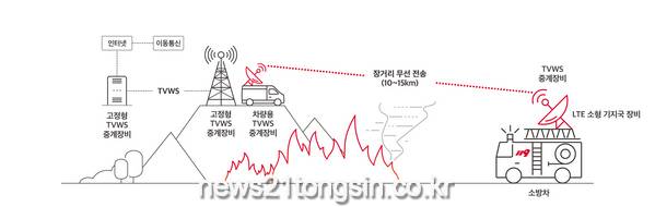 소방차에 기지국 장비와 TVWS 무선신호 중계장비를 장착, 대형산불 발생 지역에서 통신재난을 극복하는 이번 모델은 세계적으로도 사례를 찾아볼 수 없는 혁신적인 방안이다.