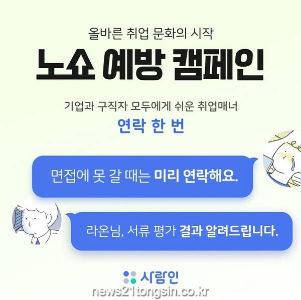 사람인은 이번 ‘노쇼 예방 캠페인’을 통해 구직자와 기업 양 측 모두 전화나 메시지 연락 한 번으로 서로를 배려할 수 있는 매너를 지킬 수 있도록 독려한다. 구직자는 면접 불참을 미리 알리고, 기업은 합격 여부를 고지 해 주자는 것.