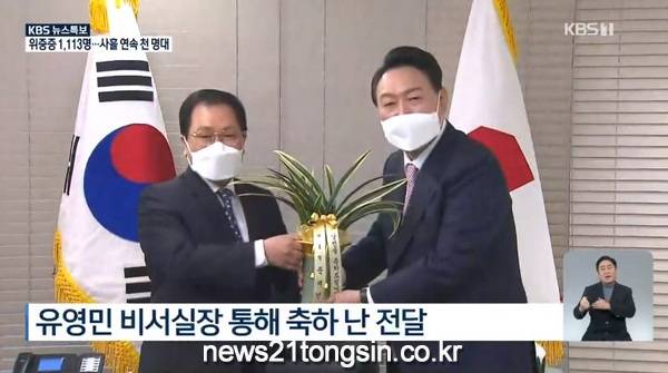 ▲ 사진=KBS NEWS윤석열 대통령 당선인이 10일 유영민 대통령 비서실장과 이철희 정무수석을 통해 문재인 대통령이 보낸 축하 난을 전달받았다.