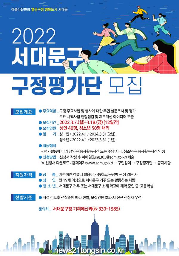 문석진 서대문구청장은 “주민자치, 경제재정, 복지문화, 환경도시, 건설교통, 보건의료 등 구정에 관심 있는 분들의 많은 응모를 바라며 평가단이 제시한 의견들을 정책 집행에 적극 반영하겠다”고 말했다.
