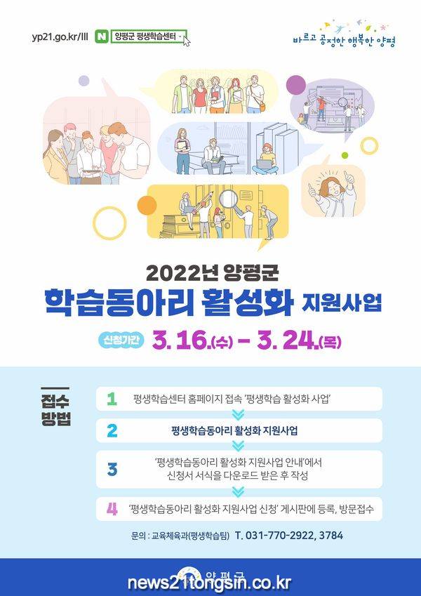 ‘2022년 학습동아리 활성화 지원사업’은 양평군 평생학습센터 홈페이지를 통해 신청할 수 있으며, 접수 후 심사를 거쳐 학습동아리를 선발할 예정이며, 최종 결과는 3월 말 홈페이지 공지사항을 통하여 확인하면 된다.