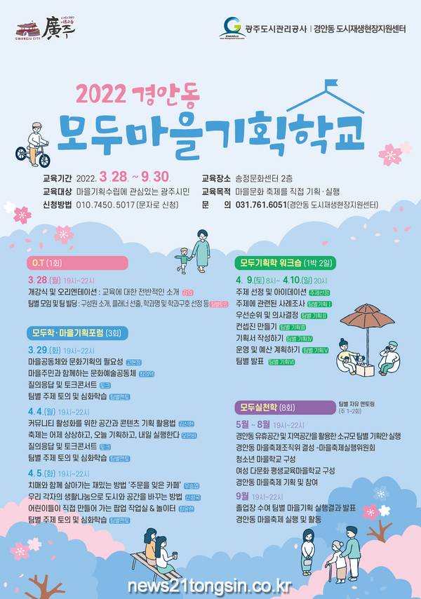 교육 일정은 3월 28일부터 9월 30까지이며 도시재생 거점시설인 송정 문화센터 2층에서 진행될 계획이다. 기타 자세한 사항은 시청 홈페이지를 참고하거나 경안동 도시재생현장지원센터(761-6051)로 문의하면 된다.