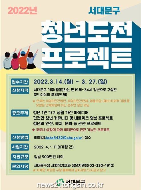 ▲  사진=서대문구서대문구는 청년들이 관심 분야에 대한 아이디어를 직접 기획 실행해 볼 수 있도록 ‘2022 청년도전 프로젝트’를 공모한다.