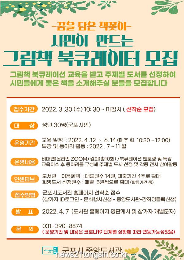 모집인원은 성인 30명으로, 멘토링과 특강 등 교육을 받은 후 7월부터 11월까지자율적 동아리를 구성해 군포시도서관의 그림책 시민북큐레이터로 활동하게 되며, 주제별로 도서를 선정하고 북컬렉션 및 각종 전시에도 참여할 계획이다.