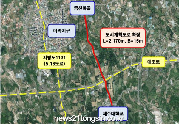 이번 사업은 제주대입구~금천마을 간 교통량 분산을 위해 총사업비 158억(보상비 76억, 공사비 82억)을 투입해 연장 2.17km 구간을 폭 15m(왕복 2차로)로 확장한다.