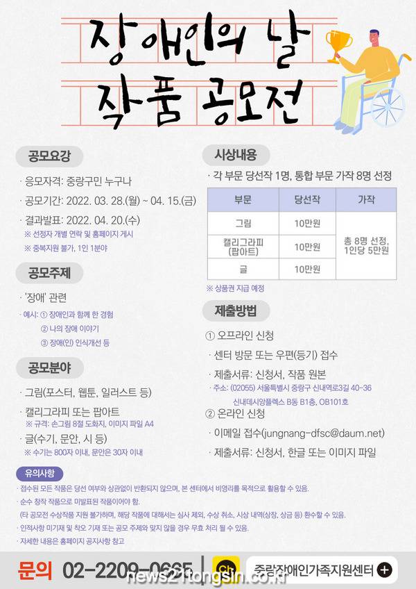 장애인의 날 기념 작품 공모전과 관련해 자세한 사항은 중랑구 홈페이지(www.jungnang.go.kr) 구정소식 게시판을 참고하거나 중랑장애인가족지원센터(☎070-4137-9941)로 문의하면 된다.