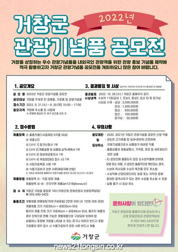한편, 2022년 거창군 관광기념품 공모전과 관련된 접수방법 등 자세한 사항은 거창군 홈페이지(http://www.geochang.go.kr) 입법/공고/고시란의 공고문을 참고하거나 군청 문화관광과(055-940-3423)로 문의하면 된다.