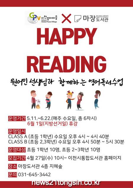'Happy Reading'은 이천영어마을과의 협약으로 원어민 선생님과 영어그림책을 읽고 다양한 독후활동을 진행하여 보다 친근감있게 영어를 배우며, 영어와 독서 두 가지 모두의 흥미를 이끌어 낼 수 있는 수업이다.
