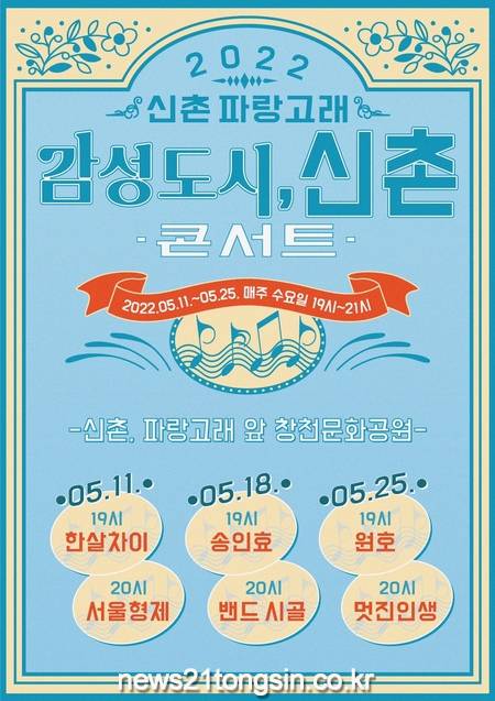 ▲  사진=서대문구서대문구는 ‘신촌, 파랑고래’ 개관 3주년을 맞아 5월 11일과, 18일, 25일 저녁 7시부터 9시까지 창천문화공원에서 ‘2022 감성도시, 신촌 콘서트’를 개최한다고 밝혔다.