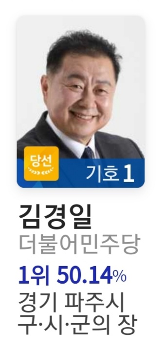 2일 오전 7시 50분 중앙선거관리위원회 개표현황을 종합한 결과, 제8회 지방동시선거에서 기초단체장인 경기 파주시장으로 김경일 더불어민주당 후보가 당선된 것으로 확인됐다. 김후보의 득표율은 50.18%였다.