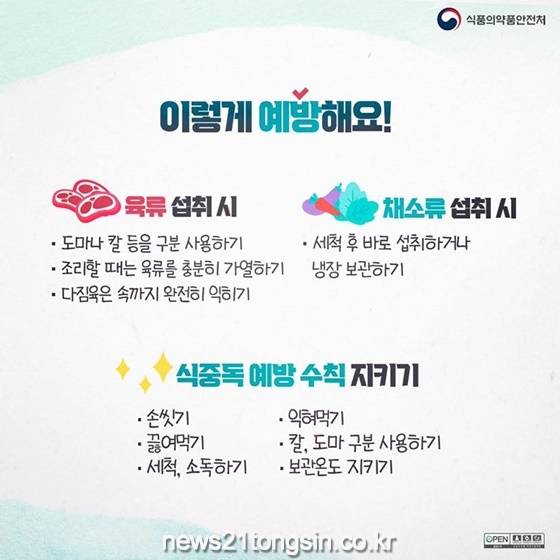 ▲ 식중독예방법. 출처: 식품의약품안전처경상북도는 세균 증식이 활발해지는 여름철을 맞아 손씻기, 익혀먹기, 끓여먹기, 칼 ‧ 도마 구분 사용하기, 세척·소독하기, 보관온도 지키기 등 식중독 예방에 주의가 필요하다고 당부했다.