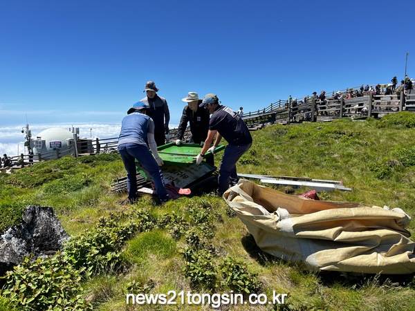 ▲  사진=제주특별자치도제주특별자치도 세계유산본부 한라산국립공원관리소는 1일 50여 명의 직원들이 나선 가운데 백록담 일대에서 대대적인 환경 정비 작업을 실시했다고 밝혔다.