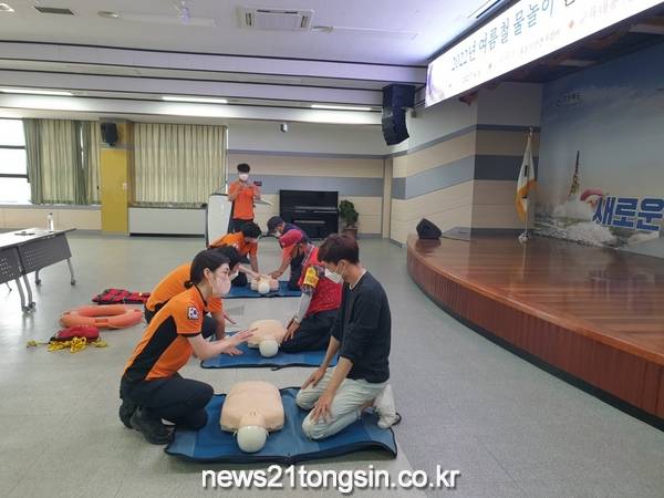 안전사고 예방교육은 물놀이 안전지킴이의 사고대응능력 확보를 위해 구명장비 사용요령 및 심폐소생술, 기본응급처리법 등을 실시하였다. 특히 물놀이 사고 시 대처요령, 안전지킴이 근무요령 등의 이론교육과 군위119안전센터의 협조로 물놀이 사고 초기 구조 및 대처요령, 심폐소생술, 물놀이 안전장비 사용법 등 현장 중심의 교육으로 이뤄졌다.