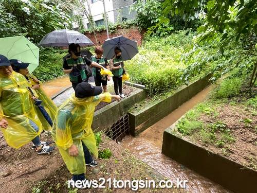 폭우에도 불구하고 20여 명의 여성민방위대원은 불광천 일대, 앵봉산 생태공원, 신사1동 및 덕산중학교 주변을 찾아 두루 살폈다.