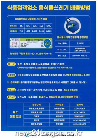 음식물쓰레기 무상수거 사업이 종료됨에 따라, 2022년 7월부터는 200㎡ 미만 식품접객업소는 업소용 음식물쓰레기 전용용기에 납부필증을 부착하여 저녁 8시부터 새벽 4시까지 내 점포 앞에 배출(토요일 제외) 해야한다.