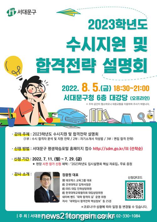 ▲  사진=서대문구서대문구가 대입 수시전형을 준비하는 수험생과 학부모들의 진로 선택에 도움을 주기 위해 ‘2023학년도 수시지원 및 합격전략 설명회’를 개최한다.