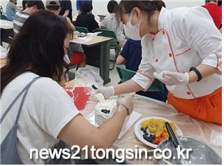 참여한 주민들은 직접 케이크 시트에 생크림을 바르고 파인애플, 블루베리 등으로 꾸며 나만의 디저트를 만들어보는 특별한 시간을 가졌다.