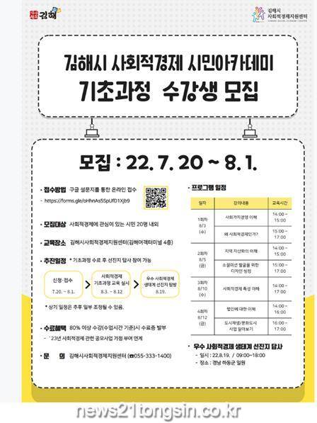 김해시는 ‘2022년 사회적경제 시민아카데미 기초과정’수강생을 모집한다고 20일 밝혔다.