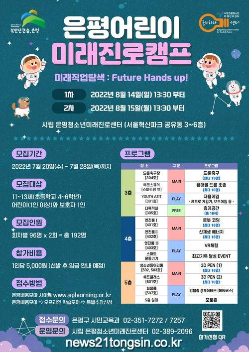 은평구 관계자는 “여름방학 동안 미래진로캠프를 통해 학부모들은 4차 사업혁명 시대 자녀 교육 방향에 대해 생각해보는 시간을 갖고, 학생들은 구체적 경험과 탐구 과정을 통해 과학적 사고를 향상하는 계기가 되길 바란다”고 전했다.