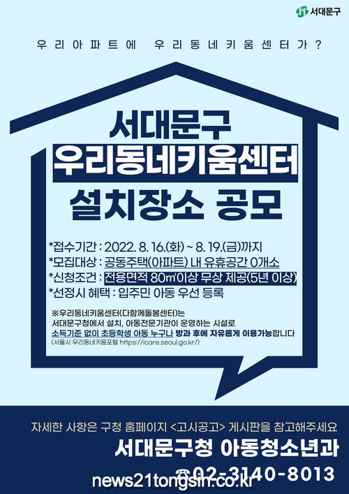 이성헌 서대문구청장은 “초등학생 자녀들이 집 가까운 곳에서 안전하고 편리하게 돌봄시설을 이용할 수 있도록 이번 우리동네키움센터 공모에 아파트 주민 분들의 많은 관심과 참여를 부탁드린다”고 말했다.