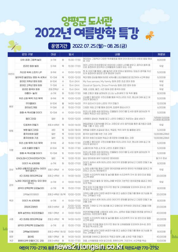 ▲  사진=양평군 / 2022 여름방학 특강 안내양평군은 여름방학을 맞이해 지난 7월 25일부터 8월 26일까지 공공도서관 4개소(어린이·용문·지평·양동) 및 공립작은도서관 7개소(강상·강하·옥천·서종·단월·청운·개군)에서 여름방학 특강 및 일반강좌를 운영한다고 밝혔다.