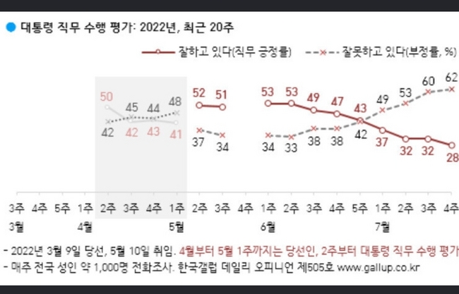 한국갤럽이 지난 26∼28일 전국 성인 1000명을 대상으로 조사한 결과(신뢰수준 95%, 표본오차 ±3.1%포인트), 윤 대통령이 대통령직 직무 수행을 ‘잘하고 있다’고 평가한 응답은 28%인 것으로 나타났다. 같은 조사에서 윤 대통령의 직무 긍정률이 20%대를 기록한 건 취임 뒤 처음이다. ‘잘못하고 있다’는 부정평가는 지난주 60%에서 2%포인트가 오른 62%를 기록했다.