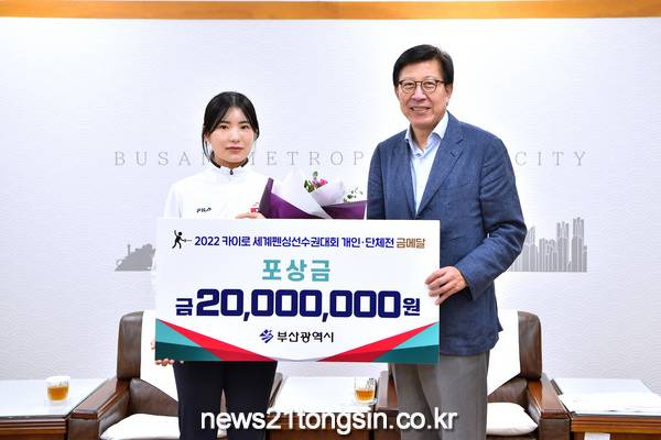 ▲ 사진=부산광역시 / (왼쪽부터)송세라 선수, 부산시 박형준 시장부산시는 오늘(29일) 2022년 카이로 세계펜싱선수권대회에서 한국 여자 펜싱 사상 첫 세계선수권대회 2관왕을 차지한 송세라 선수에게 2천만 원의 포상금을 전달했다고 밝혔다.