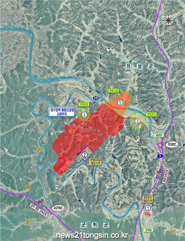 ▲ 대구경북신공항 사업부지 위치도. 경상북도 제공대구경북신공항의 밑그림이 공개되었다. 국방부와 대구시는 18일 ‘대구경북신공항 기본계획’용역 결과를 발표했다.