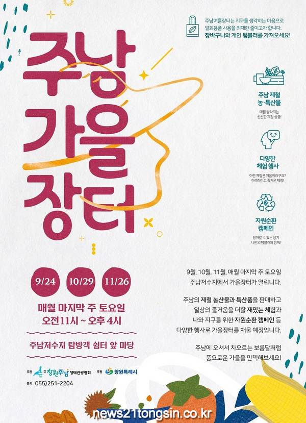 오는 24일 ‘주남 가을 장터’는 오전 11시부터 오후 4시까지 주남저수지 생태학습관 옆 공터에서 개최되며 10월 29일, 11월 26일에도 개최될 예정이다.