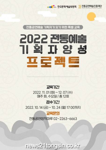 ▲ 사진=전통공연예술진흥재단전통공연예술진흥재단(이사장 김삼진)이 전통공연예술 분야 전문 기획자를 양성하기 위한 ‘2022 전통예술 기획자 양성 프로젝트’ 참가자를 10월 14일(금)부터 10월 24일(월)까지 모집한다.