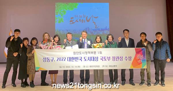 ▲  사진=성동구청서울 성동구(구청장 정원오)가 2022년 대한민국 도시대상에서 첨단도시분야 우수정책 1위로 국토교통부 장관상을 수상했다고 18일 밝혔다.