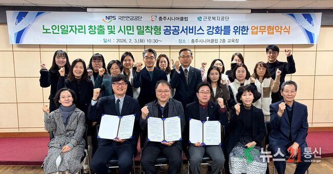 충주시니어클럽(관장 김익회)은 3일 충주시니어클럽 2층 교육장에서 국민연금공단 충주지사(지사장 안홍식), 근로복지공단 충주지사(지사장 백세현)와 함께 ‘노인일자리 창출과 공공서비스 강화를 위한 업무협약(MOU)’을 체결했다.이번 협약을 통해 충주시니어클럽은 노인일자리 및 사회활동지원사업의 하나로 기존 금융기관 중심..