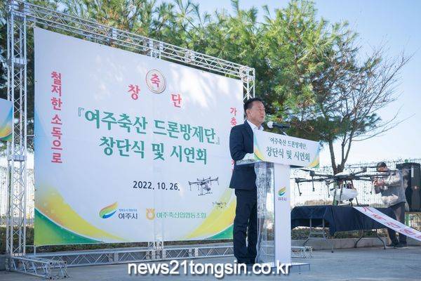 ▲  사진=여주시 제공여주시(시장 이충우)와 여주축협(조합장 조창준)은 지난 10월 26일 세종대왕면 용은리 소재 용은교에서『여주축산 드론방제단』창단식을 갖고 시연회를 개최했다.