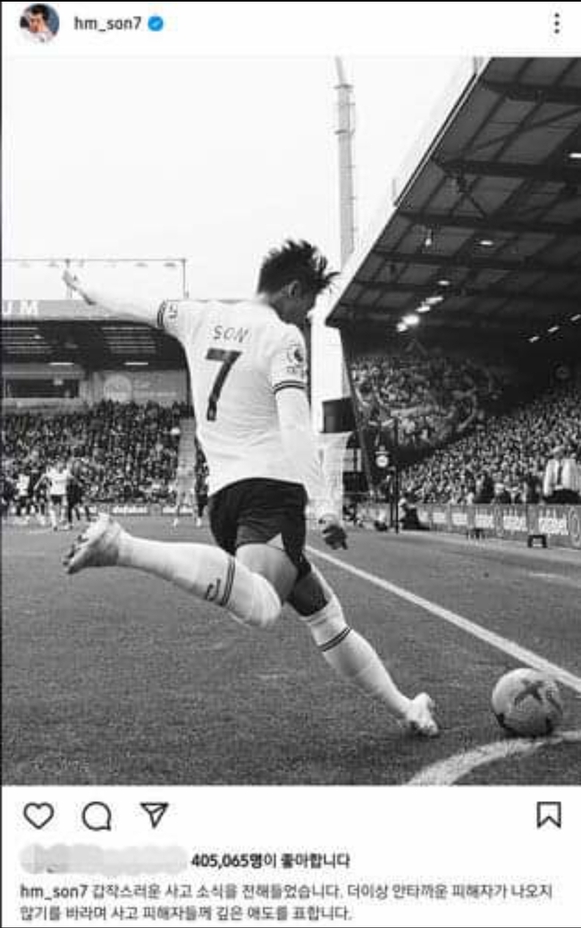 손흥민은 자신의 소셜 미디어를 통해 "갑작스러운 사고 소식을 전해 들었습니다. 더이상 안타까운 피해자가 나오지 않기를 바라며 사고 피해자들에게 깊은 애도를 표합니다"라는 글을 올렸다.