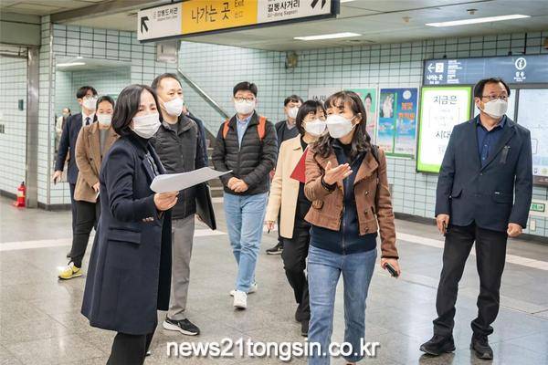 ▲  사진=이수희 강동구청장이 지난 4일(금) 서울교통공사 담당자들과 함께 길동역 2,3번 출구 내ㆍ외부를 점검하면서 에스컬레이터 설치방안을 논의하고 있는 모습이수희 강동구청장이 지난 4일(금) 서울교통공사 담당자와 함께 5호선 길동역 에스컬레이터 설치를 위한 현장점검에 나섰다고 7일 밝혔다.