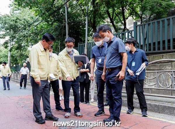 ▲ 사진=주택가 이면도로의 상태를 점검하고 있는 박강수 마포구청장(왼쪽)과 구 직원들 마포구(구청장 박강수)는 주택가 이면도로, 골목 등 주민생활과 밀접한 보도의 신속한 유지관리를 위해 동주민센터가 관할구역 내 보도블록을 자체적으로 정비할 수 있도록 개선한다.