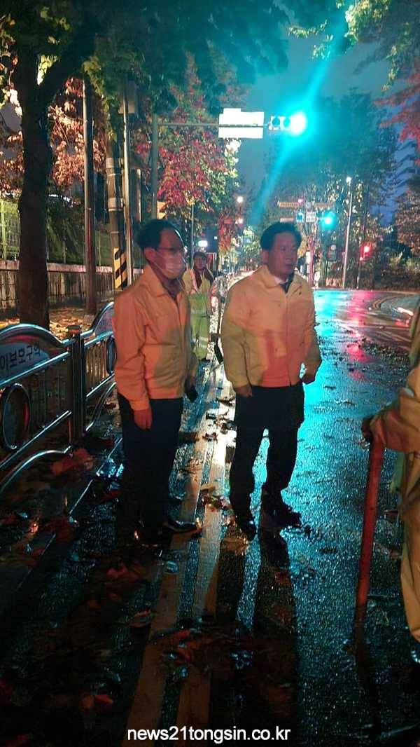 ▲ 사진=도로변 낙엽제거를 위해 현장을 살피고 있는 박강수 마포구청장지난 12일 서울과 인천 등 수도권 지역에 짧은 시간동안 비교적 많은 비가 내리면서 도로가 침수되는 등 비피해가 발생했다.