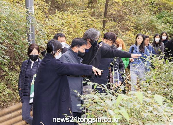 ▲ 사진=성산근린공원 재조성 상생위원회와 함께 공원을 방문하여 현장을 둘러보고 지역주민 의견을 청취하는 박강수 마포구청장성미산 개발과 보존을 두고 민관 사이 합의점을 찾지 못해 2년여 간 첨예한 갈등을 빚어온 성산근린공원 재조성 사업이 해결의 실마리를 찾았다. 성산근린공원 재조성 상생위원회를 통해서다.