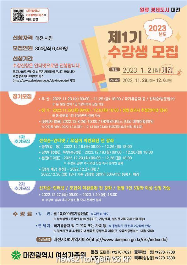 ▲  대전여성가족원, 2023년 제1기 수강생(6,459명) 모집 대전여성가족원은 오는 11월 29일부터 12월6일(18:00)까지 2023년 제1기 강좌 수강생 6,459명을 모집한다고 밝혔다.