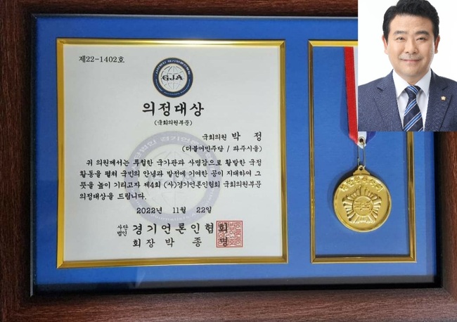 박 정 국회의원(더불어민주당,파주시을)은 지난 22일 경기도의회 광교 청사에서 개최한 '제4회 (사)경기언론인협회 의정·행정대상'에서  의정대상을 수상했다.