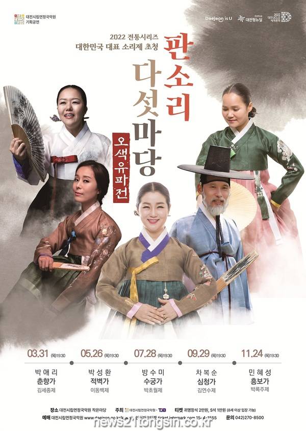 ▲  사진=<판소리 다섯마당, 오색 유파 전>포스터대전시립연정국악원(이하 국악원)이 TJB대전방송(이하 TJB)과 공동주최하는 「2022 전통시리즈 - 대한민국 대표 소리제 초청“판소리 다섯 마당, 오색 유파 전”」마지막 무대로 민혜성 명창의 <흥보가> 공연을 11월 24일(목) 오후 7시 30분 국악원 작은마당에서 개최한다.
