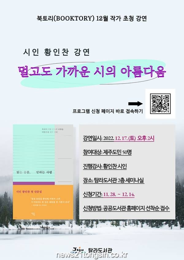제주시 탐라도서관에서는 12월 북토리 주제‘사랑’과 관련해, 황인찬 시인의 강연 ‘멀고도 가까운 시의 아름다움’을 오는 12. 17.(토) 14:00에 개최한다.