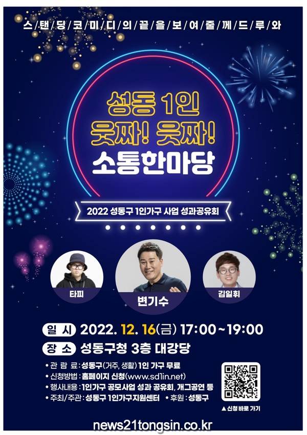 이번 행사는 성동구 1인가구지원센터 주관으로 1인가구 공모사업 성과전시, 성과공유 토크쇼 및 웃음공연 등 1인가구 전 세대가 함께 모여 웃고 소통하는 시간을 갖고자 마련되었다. 행사는 오는 16일 오후 5시 성동구청 3층 대강당에서 진행되며, 성동구에 거주하거나 활동하는 1인가구라면 누구나 참여 가능하다.