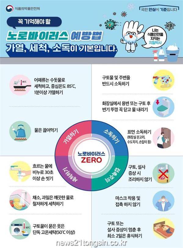 강원도 보건식품안전과(과장 전철수)는“노로바이러스는 영하 20℃ 이하의 낮은 온도에서도 생존이 가능하며, 노로바이러스에 오염된 음식물이나 지하수를 섭취했거나 감염자와의 직·간접적인 접촉으로도 노로바이러스 전파가 가능한 만큼 식중독 예방 6대 수칙 지키기 및 노로바이러스 예방법(가열·소독·세척) 준수를 적극적으로 홍보해 나가고, 겨울철 스키장, 리조트 주변 대형음식점, 휴게음식점(고속도로 휴게소 포함) 등 대중 이용이 많은 식품 환경에 대해서도 지속적인 홍보와 점검을 계속해 나갈 것“이라고 말했다.