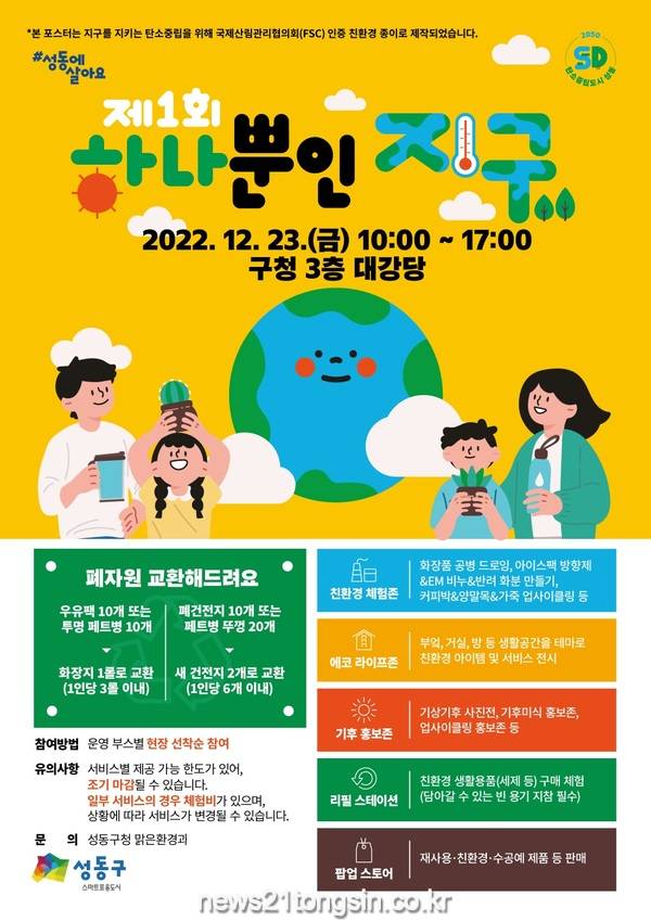 서울 성동구(구청장 정원오)가 오는 23일 구청 3층 대강당에서 탄소중립 시대에 발맞춰 ‘제1회 하나뿐인 지구’를 개최한다.